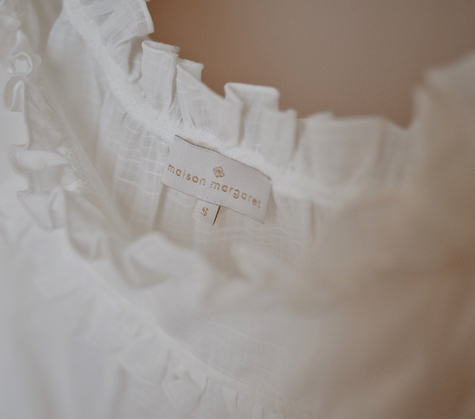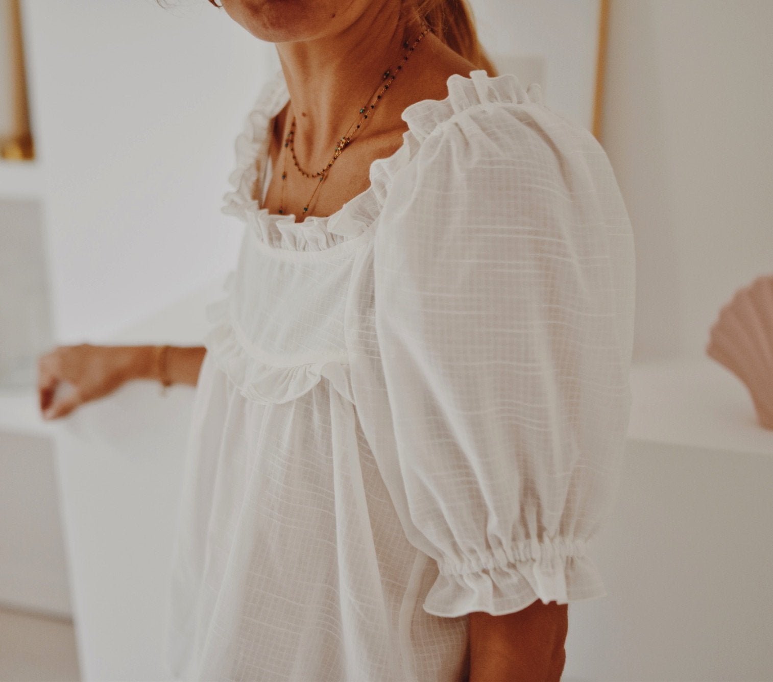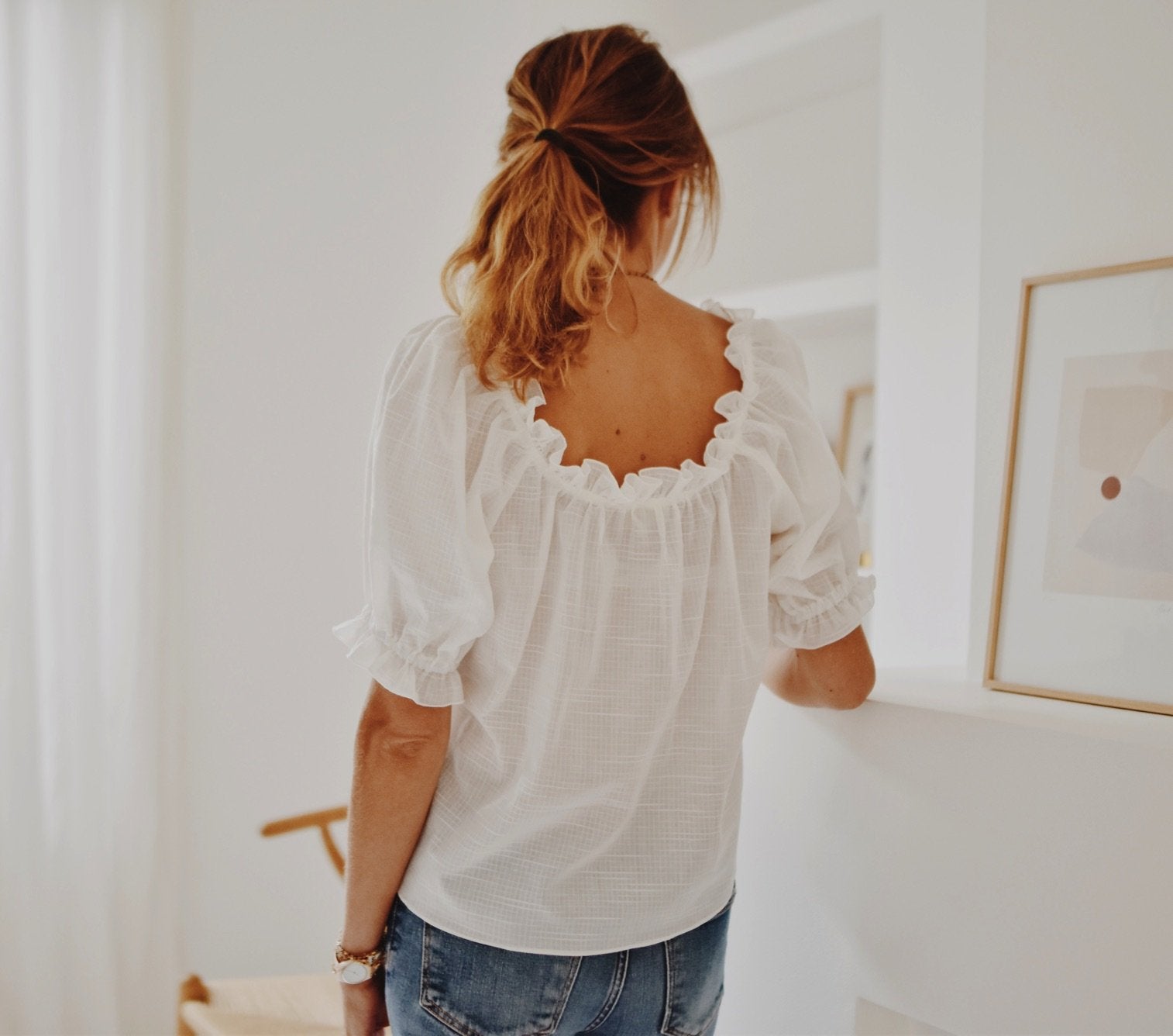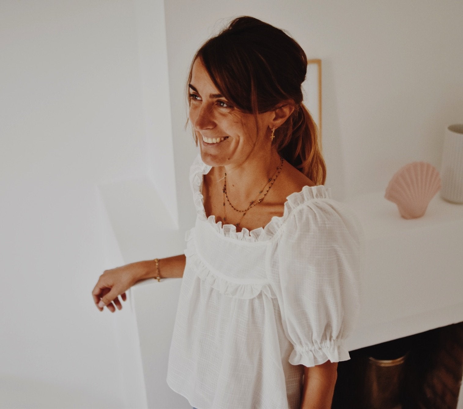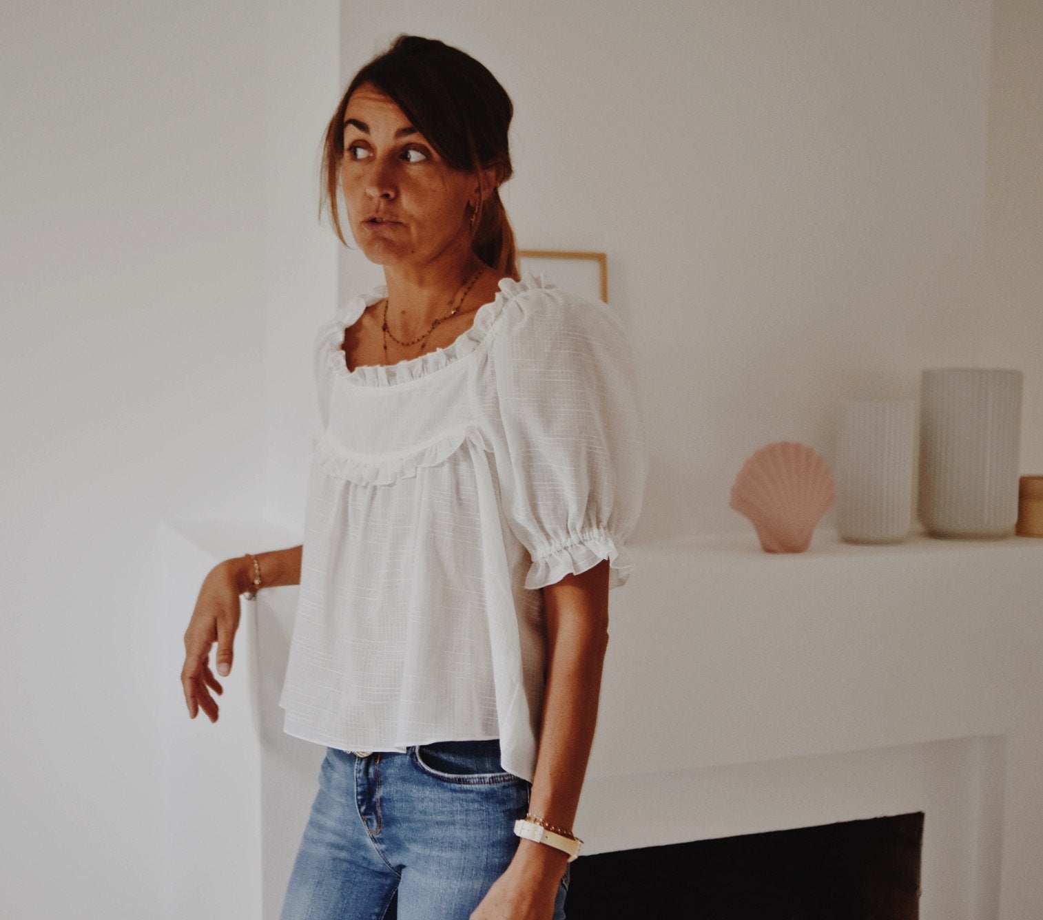 La blouse Lila est féminine, un brin romantique avec ses finitions volantées et ses manches courtes légèrement ballons.