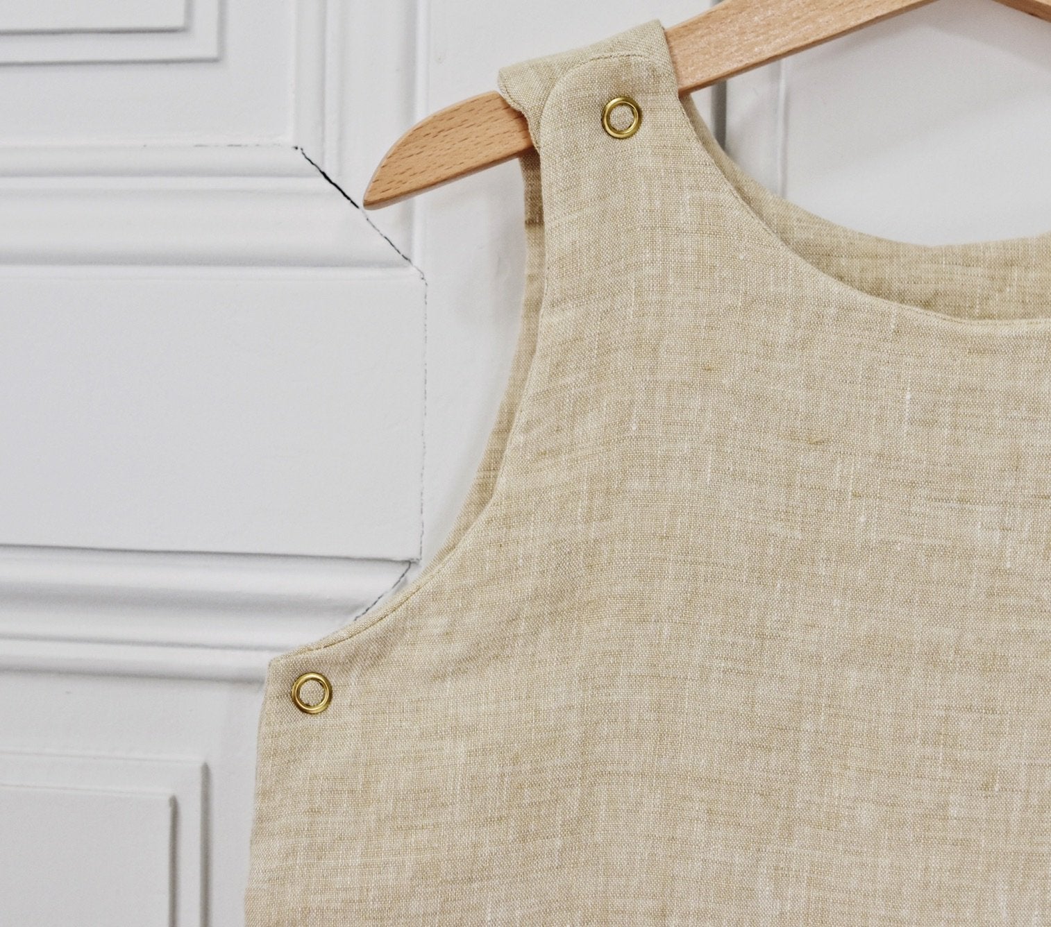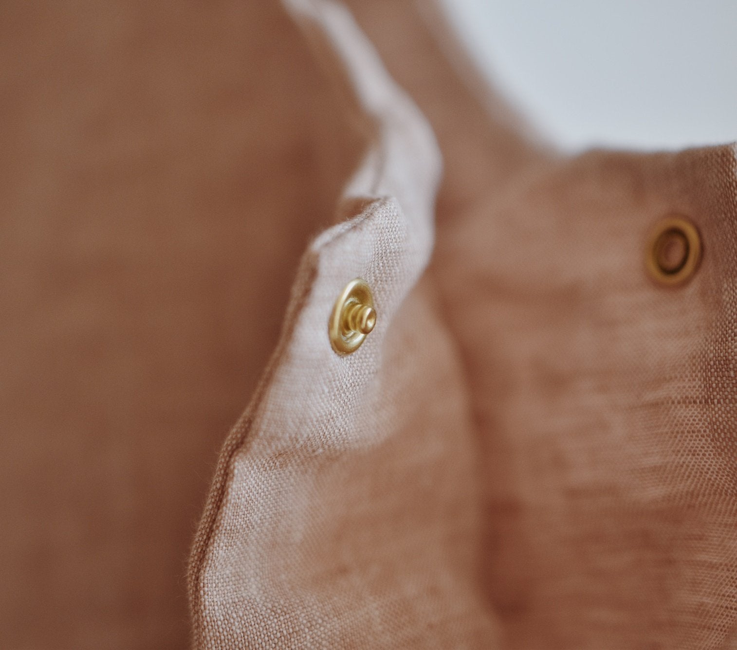 - Détails : fermée par un zip invisible sur le côté. 2 boutons pression latéraux en laiton doré + 2 boutons pression en laiton doré aux épaules.