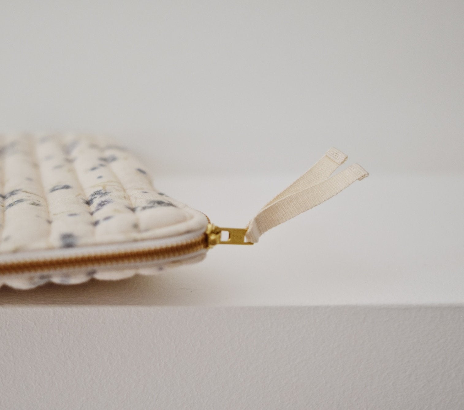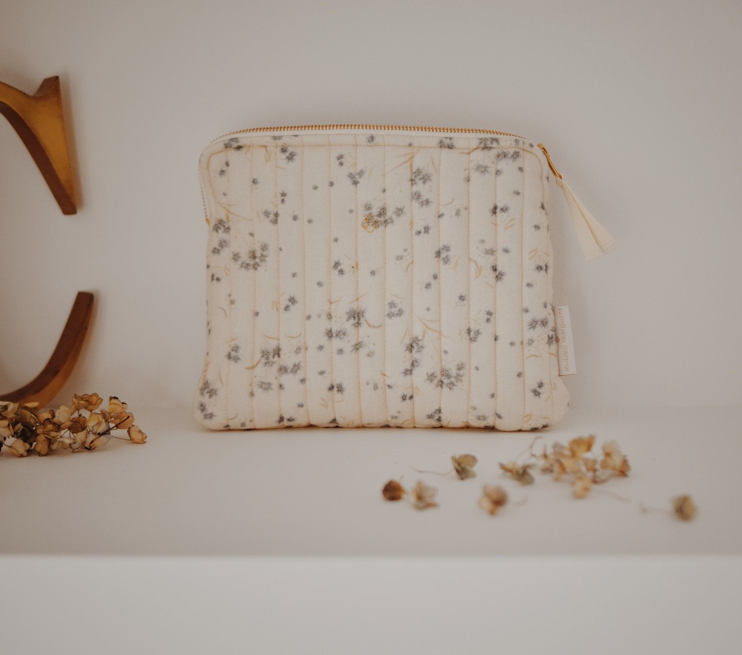 - Fermée par un zip en laiton doré et son ruban en coton écru pour faciliter l’ouverture et la fermeture de la pochette.