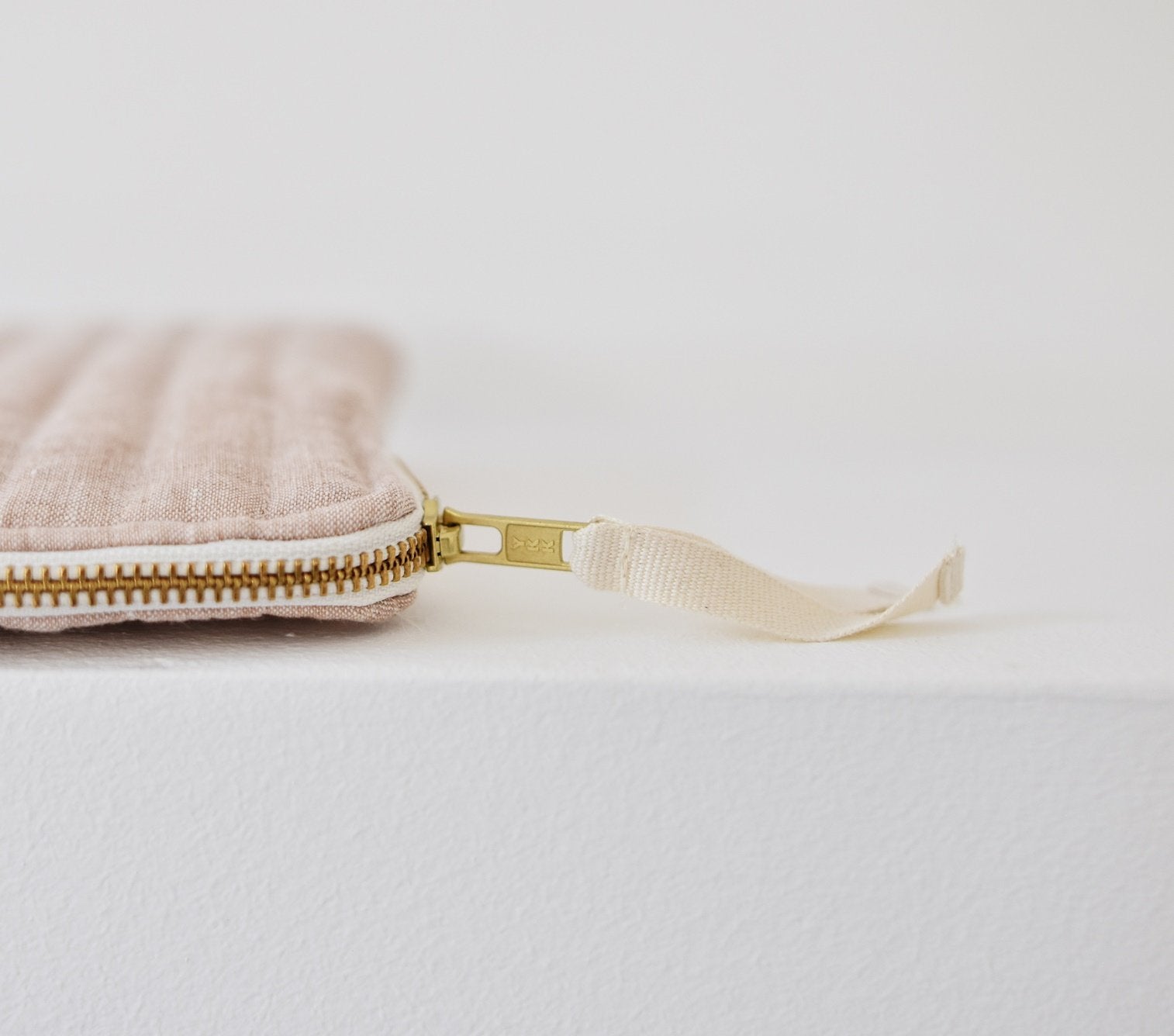 - Fermée par un zip en laiton doré et son ruban en coton écru pour faciliter l’ouverture et la fermeture de la pochette.