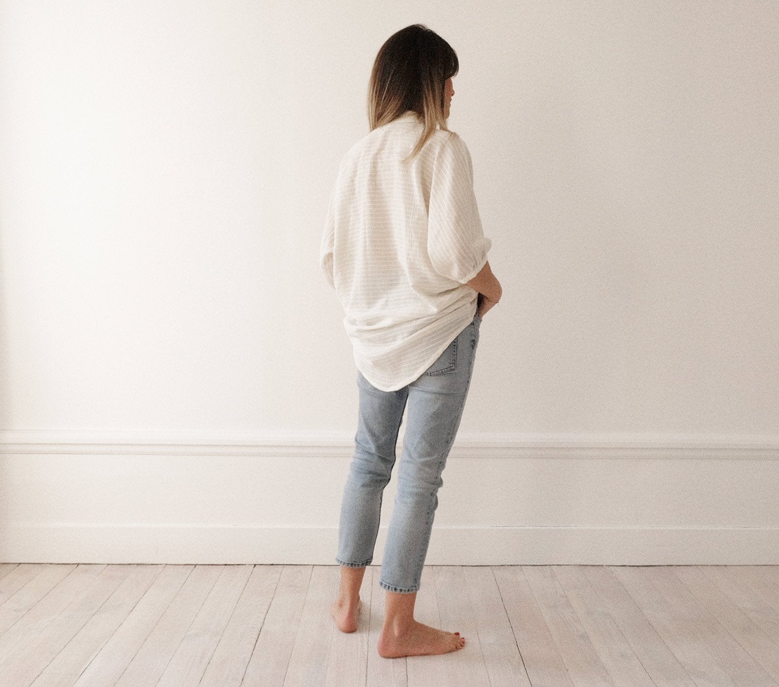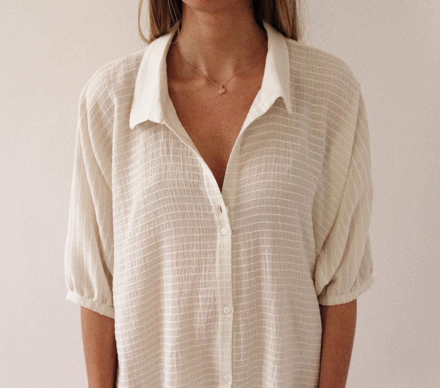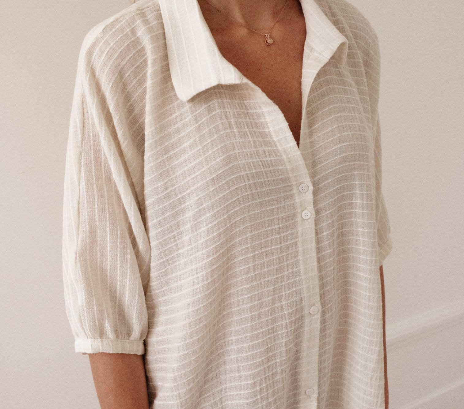 - Astuce : pour un look “ville”, rentrez votre chemise Andrea dans un pantalon / un jeans avec un blazer ou un gilet en maille. A porter également en robe de plage ouverte sur votre maillot de bain, en robe d’été avec une paire de spartiates ou avec un short en jeans ou en lin, en rentrant le devant de la chemise.
